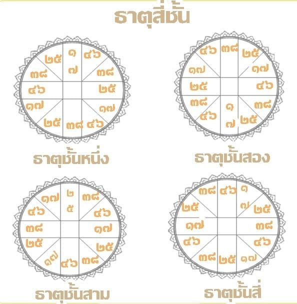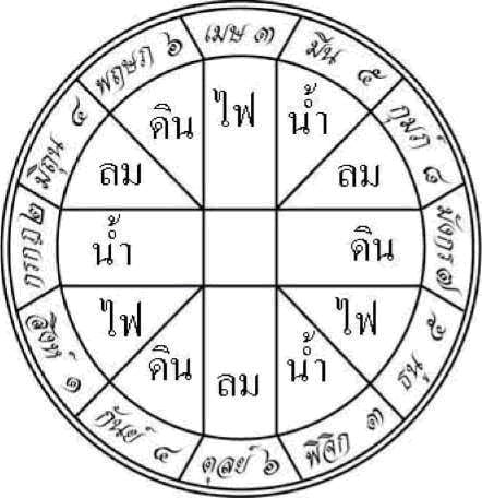 ๒.๒. ธาตุตามจักรราศี เริ่มจากราศีเมษ ธาตไฟ ราศีพฤษภ ธาตดิน ราศีมิถุน ธาตุลม ราศีกรกฎ ธาตุน้ำ